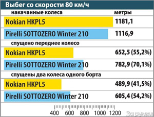 «Пирелли» в «трехколесном» варианте тормозит на 1,2 м дольше (это 12,5%), а с пустым бортом добавляет еще 0,4 м, увеличивая тормозной путь на 14,8%.