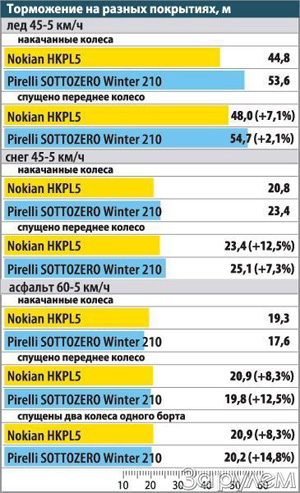 Причины разного поведения шин понятны – более мягкая по составу смеси «Нокиан» в спущенном состоянии деформируется больше, чем «Пирелли». Однако на льду шипы цепляются-таки за лед, даже частично приподнявшись над дорогой.